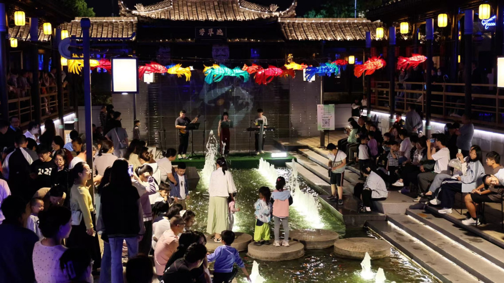 市集之上,音樂聲與歡笑聲交織回蕩。樂隊的精彩演繹中,動感旋律瞬間點燃觀眾熱情,不少市民、游客主動登臺獻(xiàn)唱,沉浸式享受熱鬧氛圍;古運河邊軒窗輕啟,舞者于窗前水袖翻飛,不時與河邊游客互動,為喧鬧市集注入了鮮活靈動的氣息。