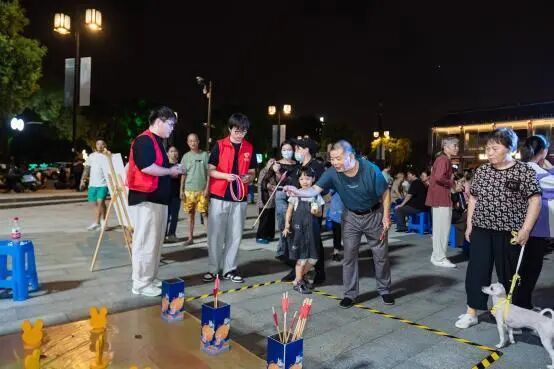 除了文化雅韻,現(xiàn)場設(shè)置了多個互動打卡與市集體驗區(qū),讓節(jié)日氛圍更添煙火氣?!拔以谛炷拊铝痢贝蚩c前,居民手持造型精巧的月亮小夜燈定格溫馨瞬間;“玉兔投壺”游戲區(qū)排起長隊,老少同樂間復(fù)刻古代士人的閑情雅趣?!霸鹿馐屑眳R集文創(chuàng)手作、中秋美食等,市民憑游園卡完成互動、集齊印章,即可兌換月亮小夜燈和冰皮月餅,將節(jié)日祝?;饔|手可及的溫暖。