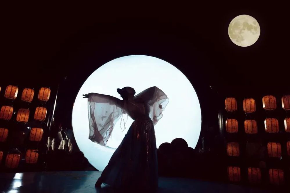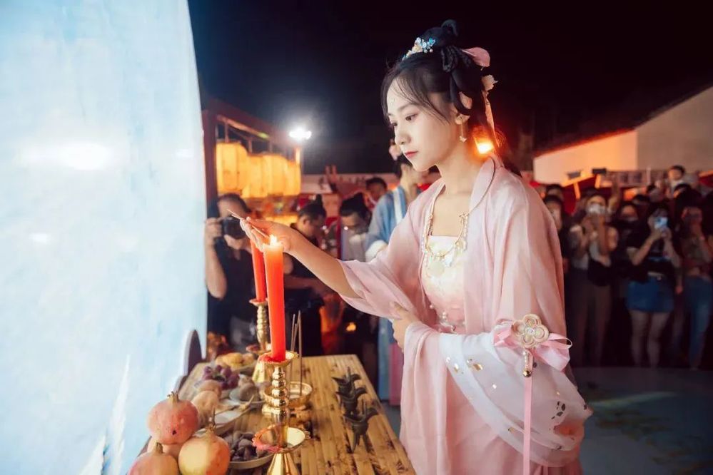 一場(chǎng)莊重的拜月儀式則是將活動(dòng)推向高潮,設(shè)案于露天,借月光與燭光。數(shù)十位身著漢唐服飾的佳人,神情莊重、步履輕緩。