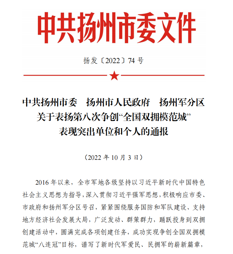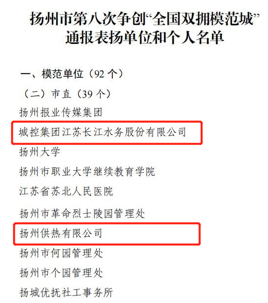 近日,揚(yáng)州市市委、市政府、軍分區(qū)印發(fā)《關(guān)于表?yè)P(yáng)第八次爭(zhēng)創(chuàng)“全國(guó)雙擁模范城”表現(xiàn)突出單位和個(gè)人的通報(bào)》,城控集團(tuán)所屬江蘇長(zhǎng)江水務(wù)股份有限公司、揚(yáng)州供熱有限公司兩家單位榮獲爭(zhēng)創(chuàng)“全國(guó)雙擁模范城”表現(xiàn)突出單位。