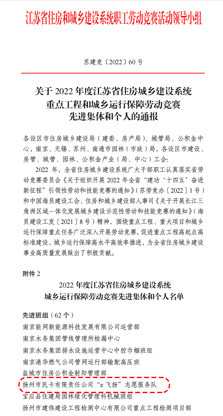 近日,江蘇省住房和城鄉(xiāng)建設(shè)系統(tǒng)職工勞動競賽活動領(lǐng)導(dǎo)小組發(fā)布《關(guān)于2022 年度江蘇省住房城鄉(xiāng)建設(shè)系統(tǒng)重點工程和城鄉(xiāng)運行保障勞動競賽先進集體和個人的通報》,市民卡公司“e 飛揚”志愿服務(wù)隊被授予“2022 年度江蘇省住房城鄉(xiāng)建設(shè)系統(tǒng)城鄉(xiāng)運行保障勞動競賽先進班組”光榮稱號。
