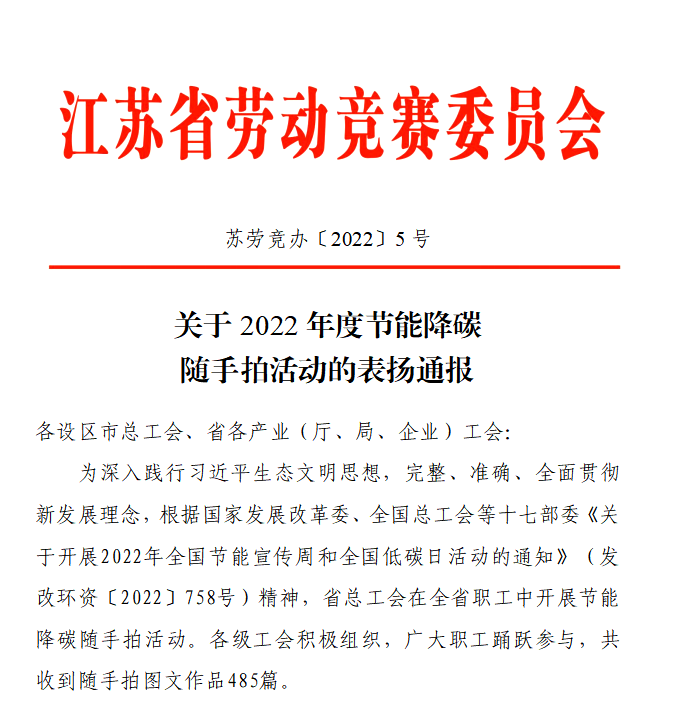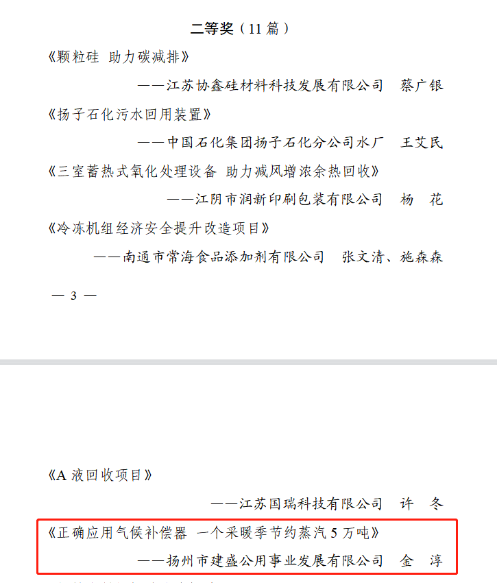 近日,江蘇省勞動(dòng)競(jìng)賽委員會(huì)發(fā)布《關(guān)于2022年度節(jié)能降碳隨手拍活動(dòng)的表?yè)P(yáng)通報(bào)》,揚(yáng)州市建盛公用事業(yè)發(fā)展有限公司金淳同志的作品——《正確應(yīng)用氣候補(bǔ)償器 一個(gè)采暖季節(jié)約蒸汽5萬(wàn)噸》榮獲二等獎(jiǎng)。