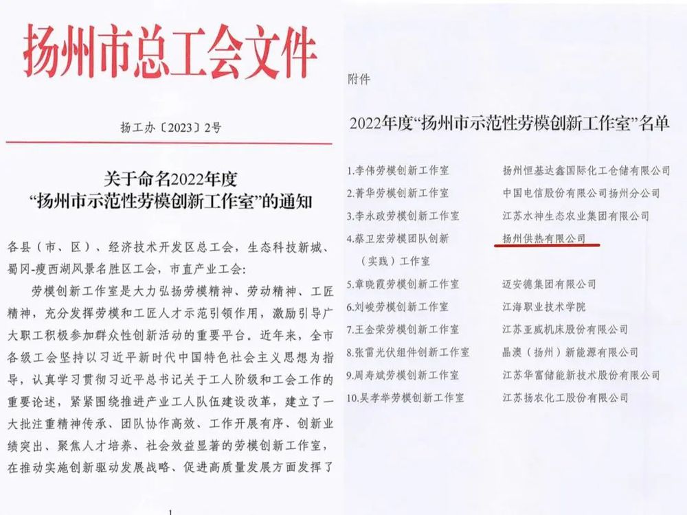 近日,供熱公司勞模團隊創(chuàng)新(實踐)工作室被揚州市總工會授予“揚州市示范性勞模創(chuàng)新工作室”榮譽稱號。