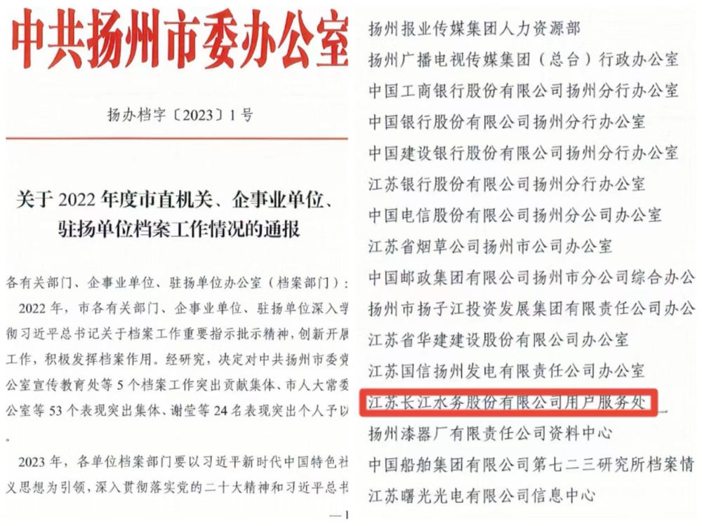 近日,長江水務(wù)公司用戶服務(wù)處獲得中共揚州市委辦公室頒發(fā)的“2022年度檔案工作表現(xiàn)突出集體”榮譽稱號。