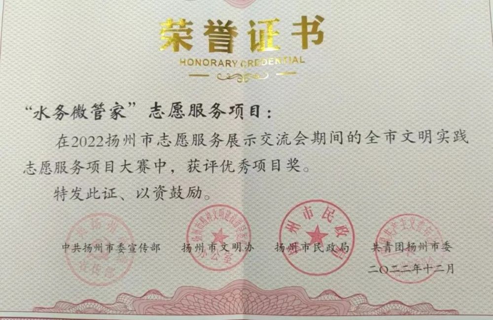 在2022年揚(yáng)州市志愿服務(wù)展示交流暨文明實(shí)踐志愿服務(wù)項(xiàng)目大賽中,長江水務(wù)“水務(wù)微管家”志愿服務(wù)項(xiàng)目脫穎而出,被市委宣傳部、市文明辦、市民政局、共青團(tuán)揚(yáng)州市委評為優(yōu)秀項(xiàng)目獎。