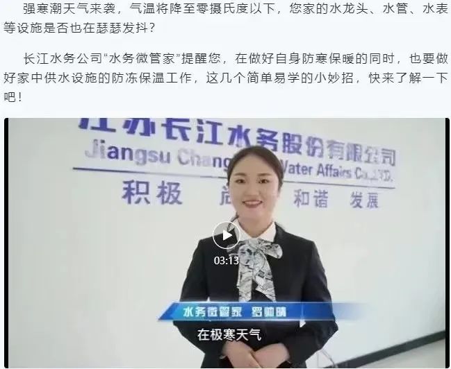 “水務(wù)微管家”開通企業(yè)微信平臺,攝制多條微視頻,推送供水服務(wù)咨詢,普及自來水知識,與重點(diǎn)用水企業(yè)實(shí)現(xiàn)“一對一”線上線下聯(lián)動服務(wù)。在寒潮降溫前,通過企業(yè)微信平臺、社區(qū)網(wǎng)格、志愿者服務(wù)微信群密集發(fā)布冬季自來水防凍提醒,上門為老年用戶和弱勢群體做好冬季用水設(shè)施的防凍保溫措施。