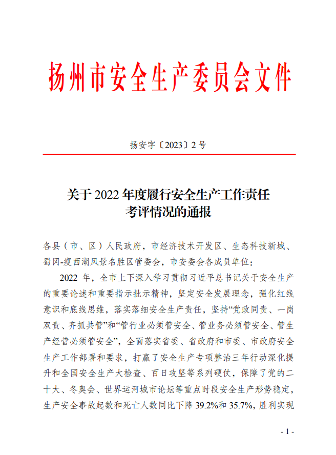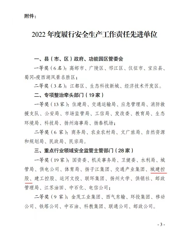 2022年,城控集團(tuán)深入貫徹落實(shí)習(xí)近平總書記關(guān)于安全生產(chǎn)重要思想論述,堅(jiān)守“生命至上、安全發(fā)展”理念,全面落實(shí)安全生產(chǎn)責(zé)任,強(qiáng)化工作舉措,順利完成市安委會(huì)下達(dá)的目標(biāo)任務(wù),被表彰為2022年度履行安全生產(chǎn)工作責(zé)任先進(jìn)單位一等獎(jiǎng)。