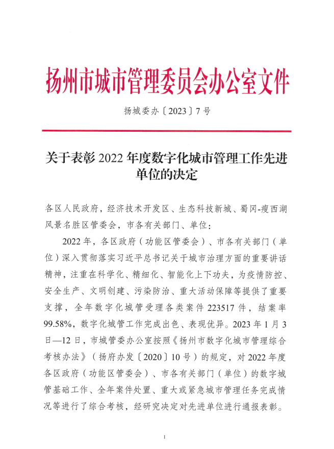 2022年,城控集團(tuán)深入貫徹落實(shí)市委市政府關(guān)于城市治理精神要求,建立健全數(shù)字化城管工作的辨識(shí)、核查、處置機(jī)制,及時(shí)高效處置各類(lèi)案件,被表彰為年度數(shù)字化城市管理工作先進(jìn)單位一等獎(jiǎng)。