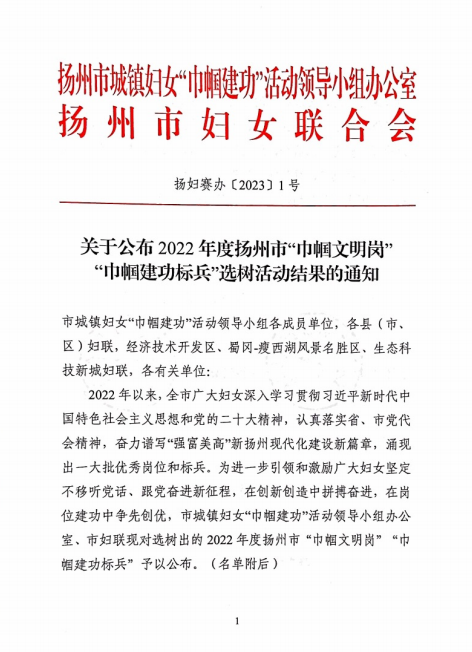 近日,市婦聯(lián)、市婦女“巾幗建功”活動(dòng)領(lǐng)導(dǎo)小組聯(lián)合表彰了一批揚(yáng)州市“巾幗文明崗”和“巾幗建功標(biāo)兵”。揚(yáng)州市政管網(wǎng)有限公司“890管網(wǎng)服務(wù)隊(duì)”榮獲“巾幗文明崗”稱號(hào)。