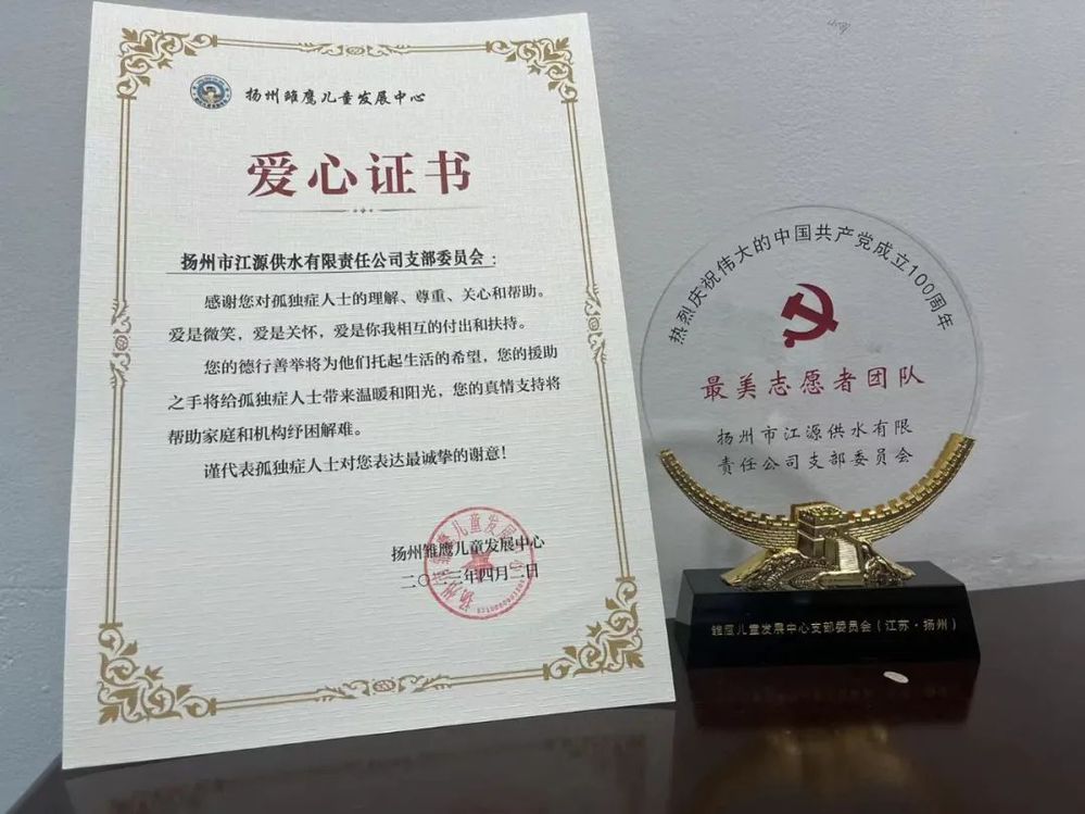 日前,長(zhǎng)江水務(wù)江源公司“561”供水服務(wù)隊(duì)榮獲揚(yáng)州市殘聯(lián)雛鷹兒童發(fā)展中心送來(lái)的愛(ài)心證書(shū),感謝“561”供水服務(wù)隊(duì)的幫扶和服務(wù),并授予其“最美志愿團(tuán)隊(duì)”稱(chēng)號(hào)。