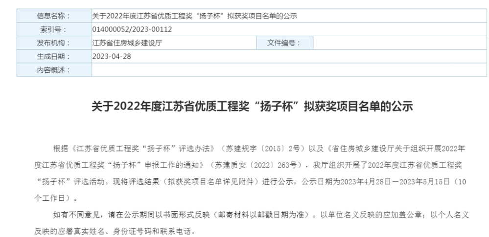 “揚(yáng)子杯”由江蘇省住建廳、江蘇省建筑工程管理局、江蘇省建筑行業(yè)協(xié)會組織評選,是全省建筑工程質(zhì)量最高榮譽(yù)獎(jiǎng),評選對象為省內(nèi)已經(jīng)建成并投入使用的各類建設(shè)工程,每年評審一次,實(shí)行獲獎(jiǎng)項(xiàng)目總量控制,當(dāng)年獲獎(jiǎng)總量不超過上一年度竣工驗(yàn)收項(xiàng)目數(shù)量的百分之一。