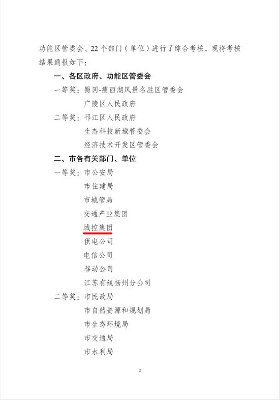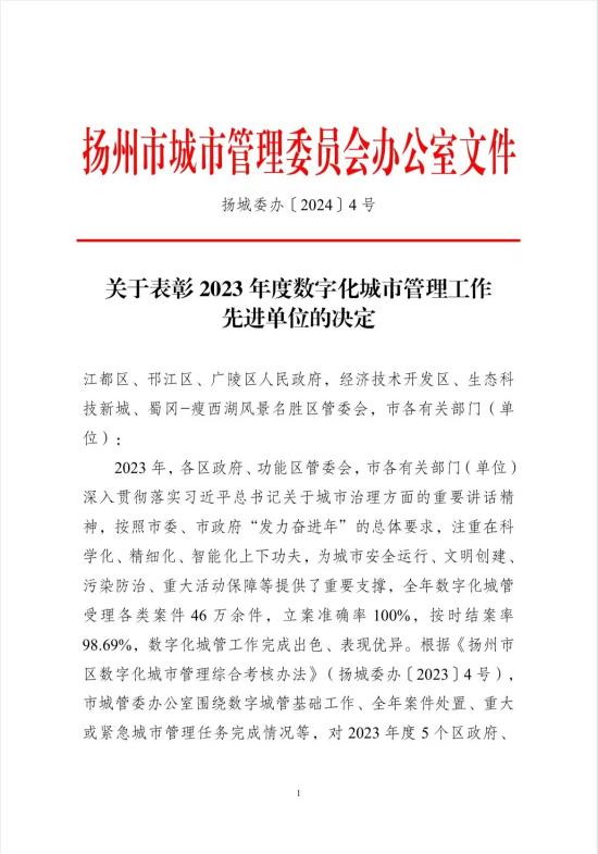 近日,揚州市城市管理委員會辦公室發(fā)布《關(guān)于表彰2023年度數(shù)字化城市管理工作先進單位的決定》,城控集團榮獲“2023年度數(shù)字化城市管理工作先進單位”一等獎。